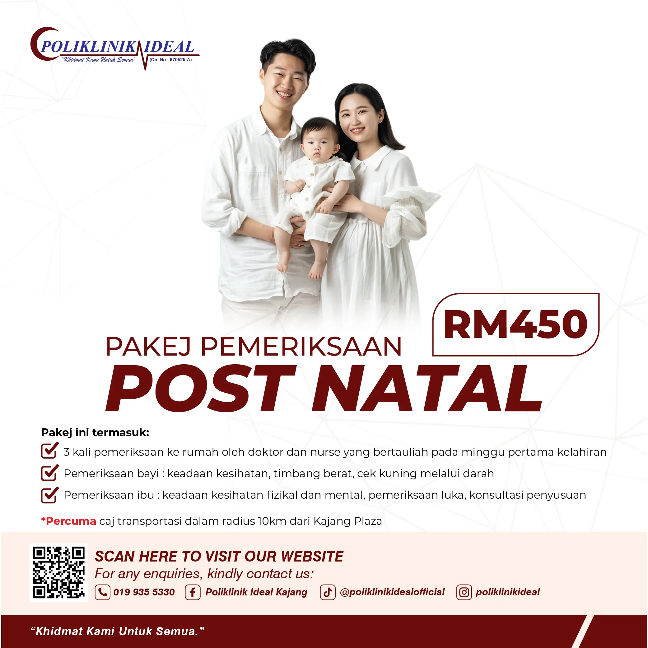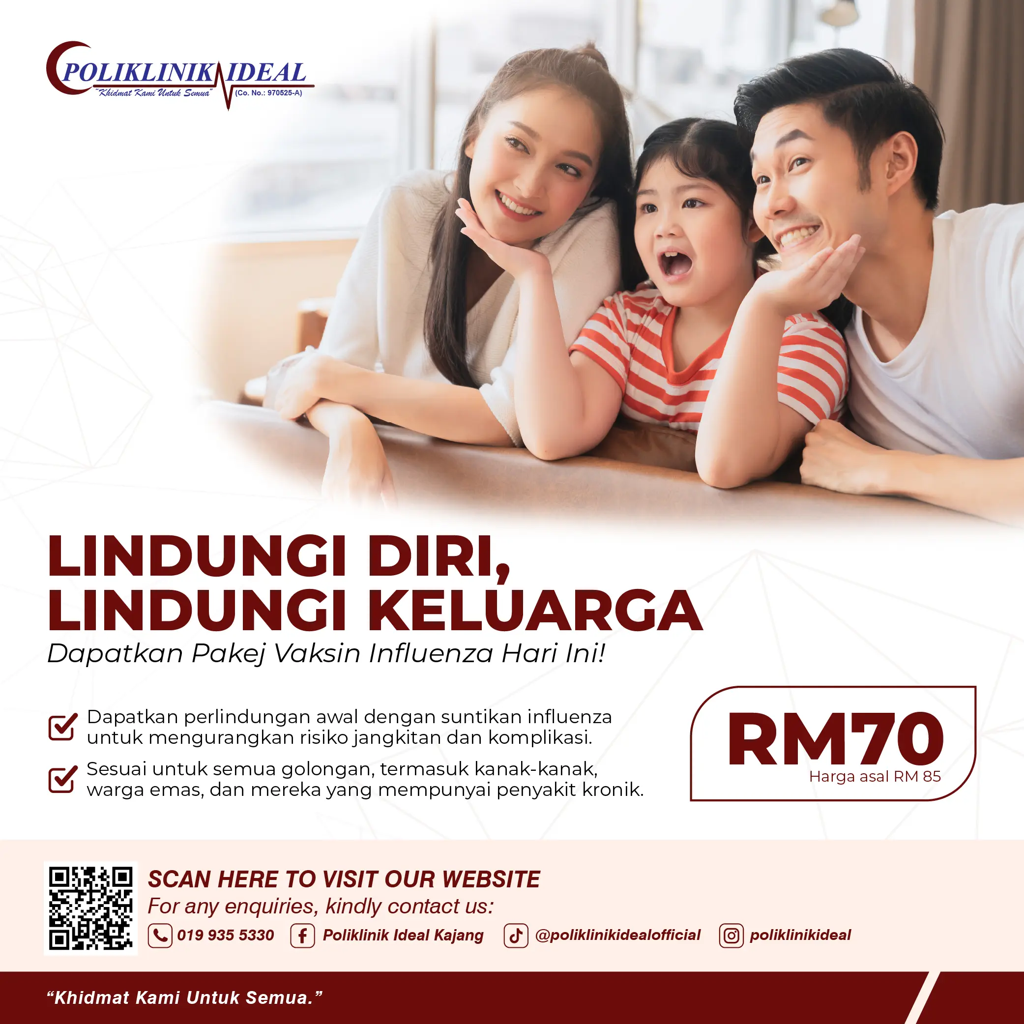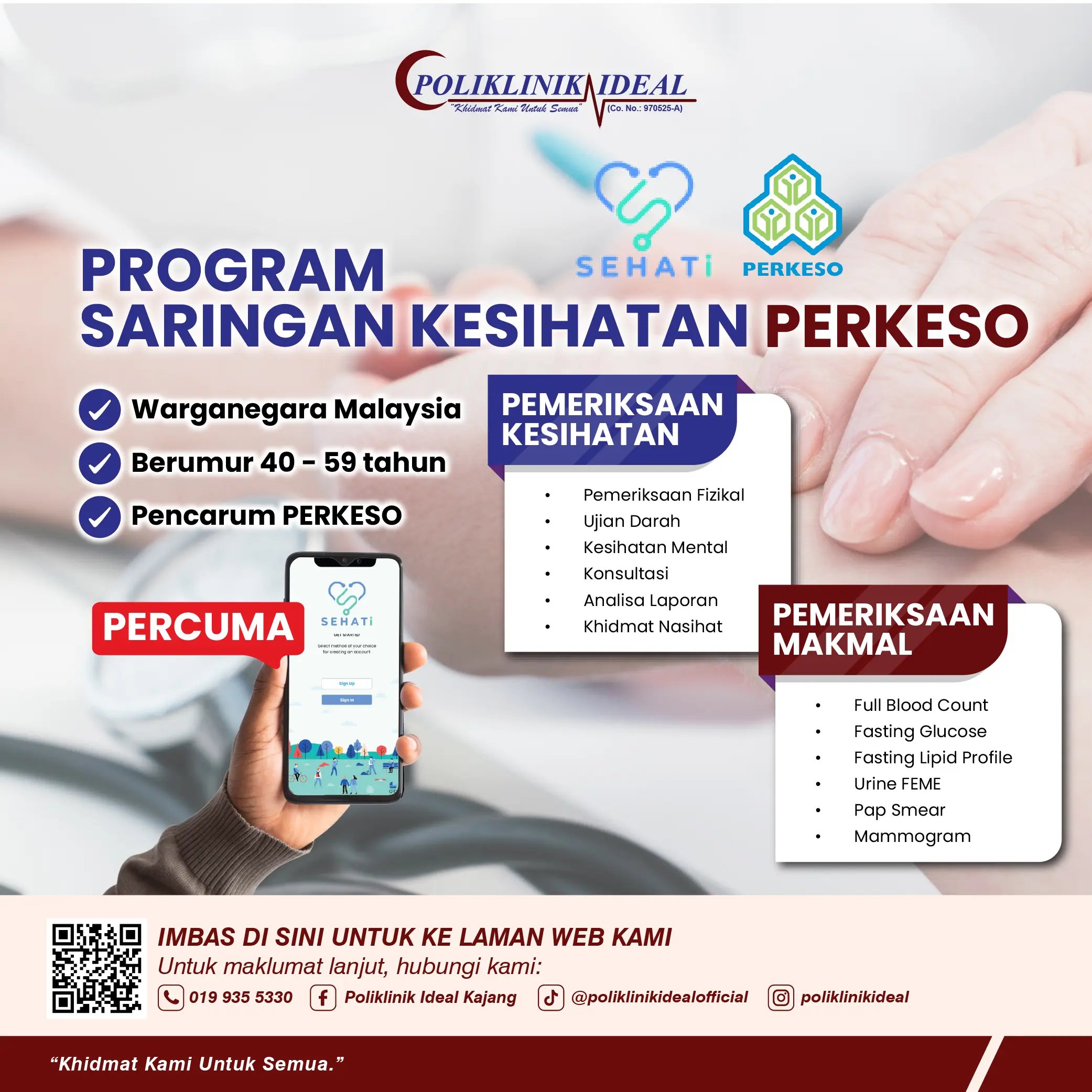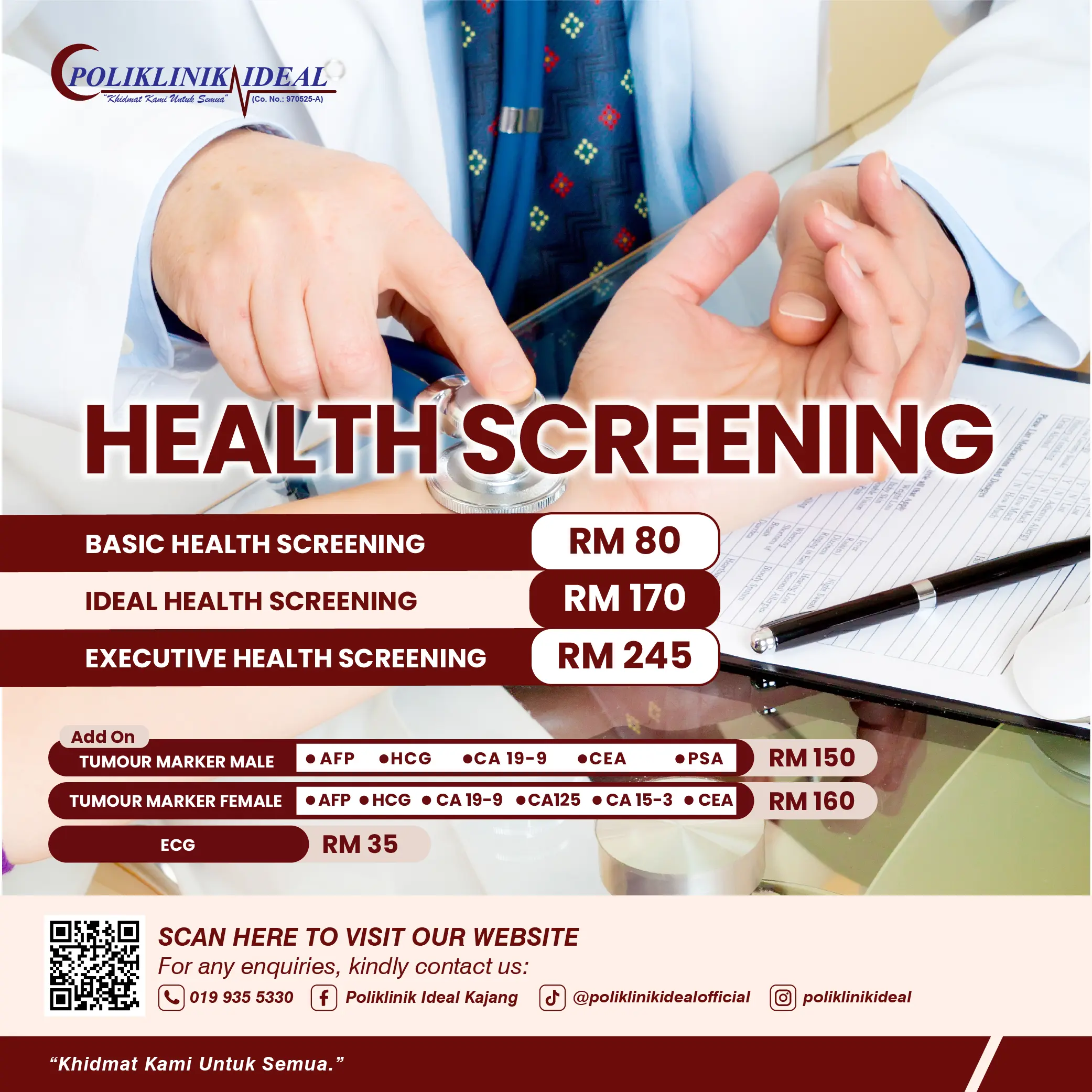 Pemeriksaan kesihatan menyeluruh amat penting untuk memantau tahap kesihatan anda walaupun tiada simptom penyakit. Di Poliklinik Ideal, kami menawarkan pemeriksaan tekanan darah, paras gula, kolesterol, fungsi organ dalaman, serta nasihat kesihatan daripada doktor. Langkah pencegahan awal membantu mengesan penyakit sebelum menjadi lebih serius.